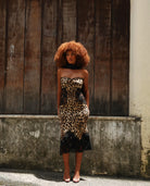 Own the room in this fearless animal print dress that refuses to blend in. With a strapless cut and strategically placed lace on the sides reveal just enough to keep everyone guessing. A corset back to adjust and sculpt your silhouette into pure power. This is the dress for those who aren't afraid to turn heads, command attention, and embrace their most daring self.
