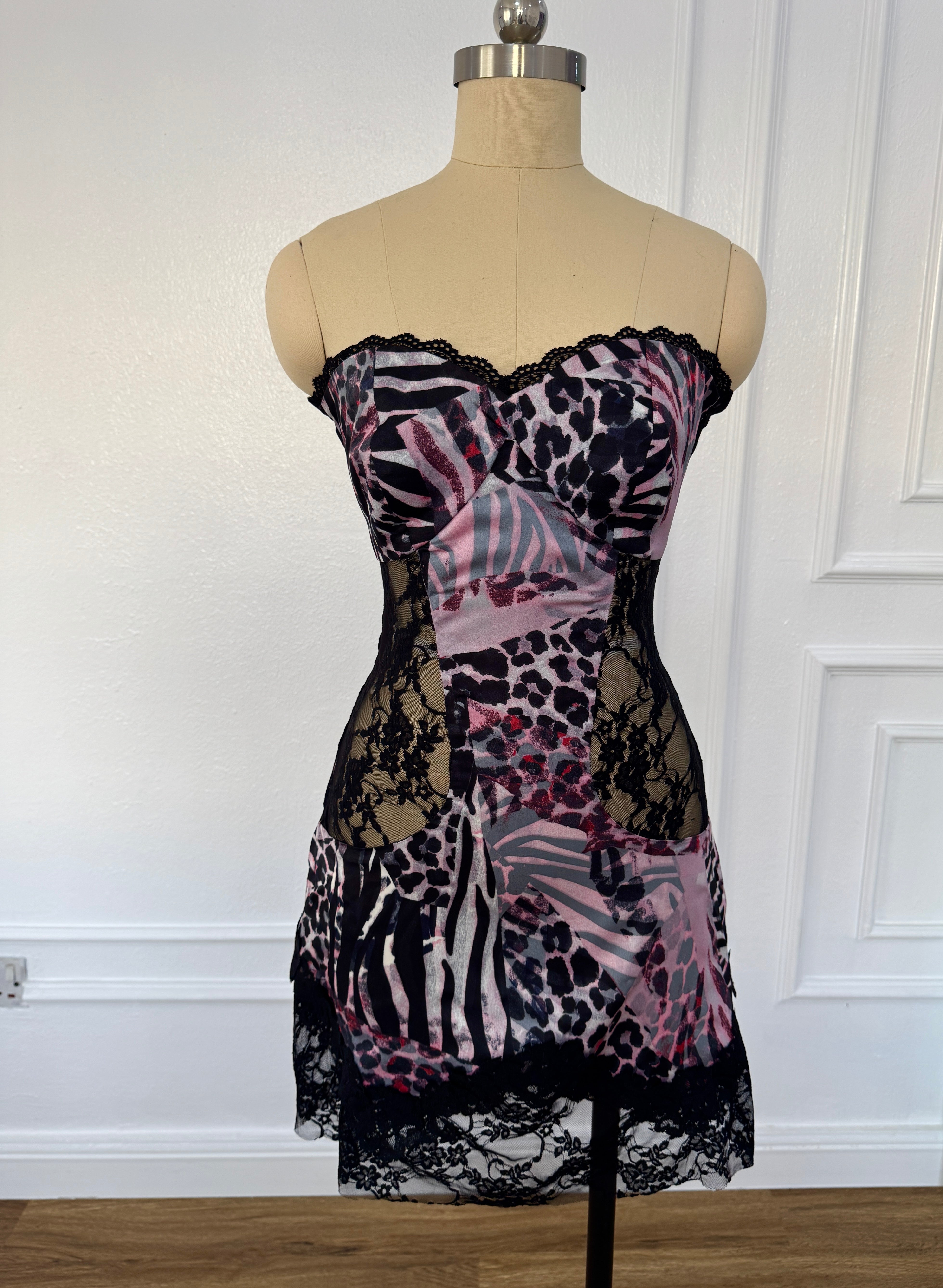Own the room in this fearless animal print dress that refuses to blend in. With a strapless cut and strategically placed lace on the sides reveal just enough to keep everyone guessing. A corset back to adjust and sculpt your silhouette into pure power. This is the dress for those who aren't afraid to turn heads, command attention, and embrace their most daring self.