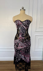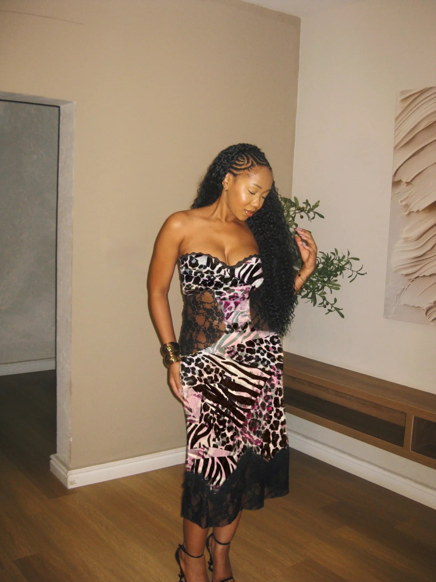 Own the room in this fearless animal print dress that refuses to blend in. With a strapless cut and strategically placed lace on the sides reveal just enough to keep everyone guessing. A corset back to adjust and sculpt your silhouette into pure power. This is the dress for those who aren't afraid to turn heads, command attention, and embrace their most daring self.