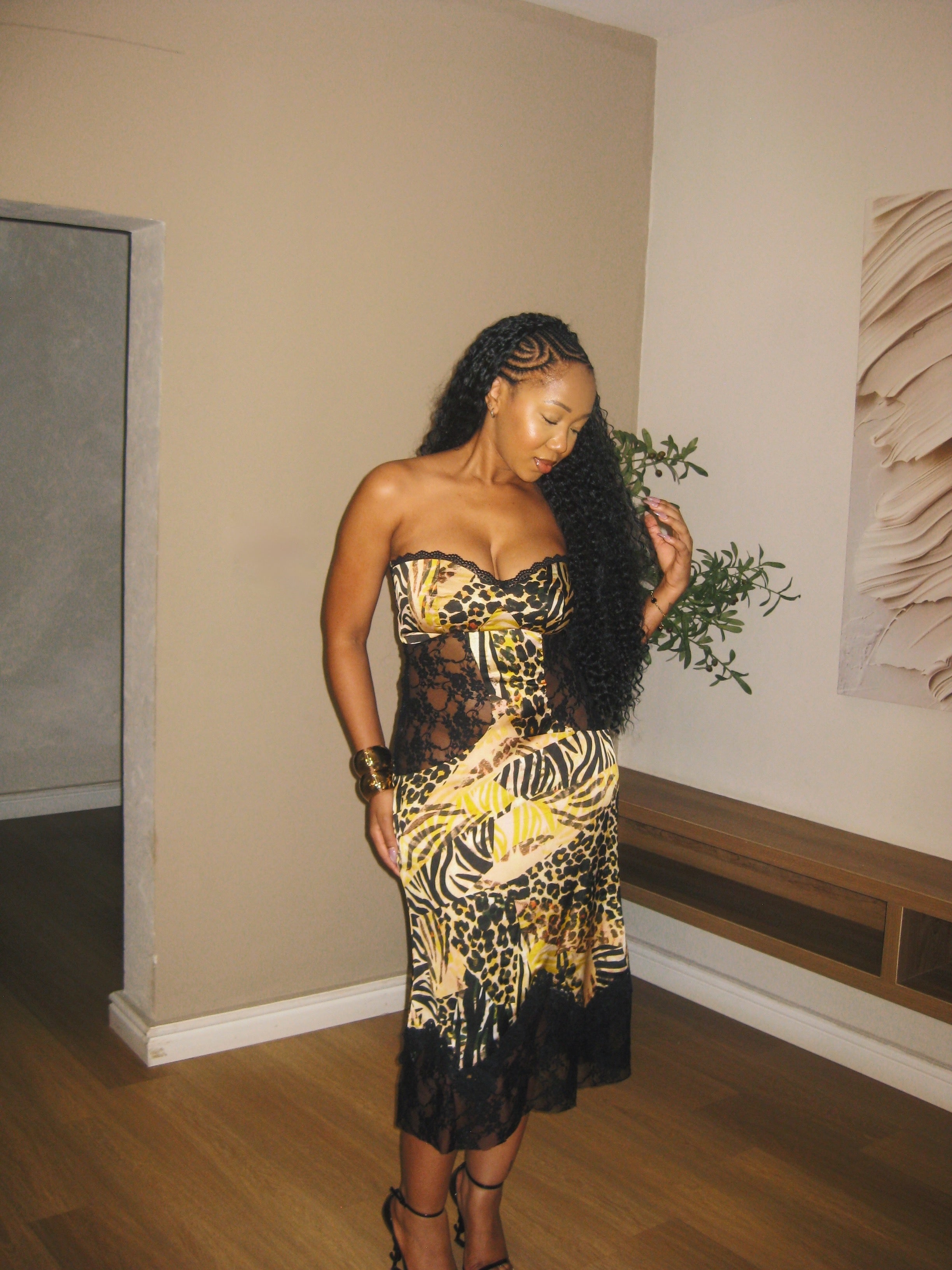 Own the room in this fearless animal print dress that refuses to blend in. With a strapless cut and strategically placed lace on the sides reveal just enough to keep everyone guessing. A corset back to adjust and sculpt your silhouette into pure power. This is the dress for those who aren't afraid to turn heads, command attention, and embrace their most daring self.