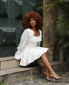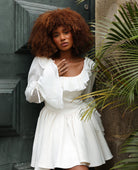 Elevate your wardrobe with this white ruffle mini dress, designed for women who love romantic, feminine style. Featuring a soft ruffled neckline, long airy sleeves, and a flattering fitted waist, this dress creates a timeless silhouette that moves beautifully.