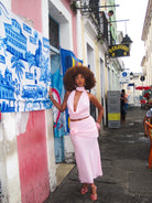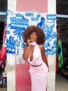Elevate your wardrobe with this blush pink two-piece set. Featuring a plunging halter neckline and a draped skirt with a sculpted side knot, this set offers a flattering silhouette that moves beautifully.