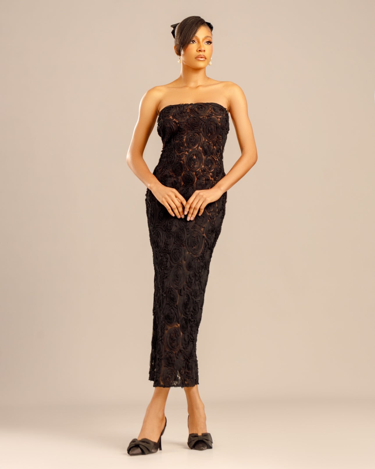 This black mesh dress features a classic strapless design and delicate floral fabric, creating a sophisticated and feminine look. Elevate your style with this classy Ananhi Dress that exudes elegance and charm.