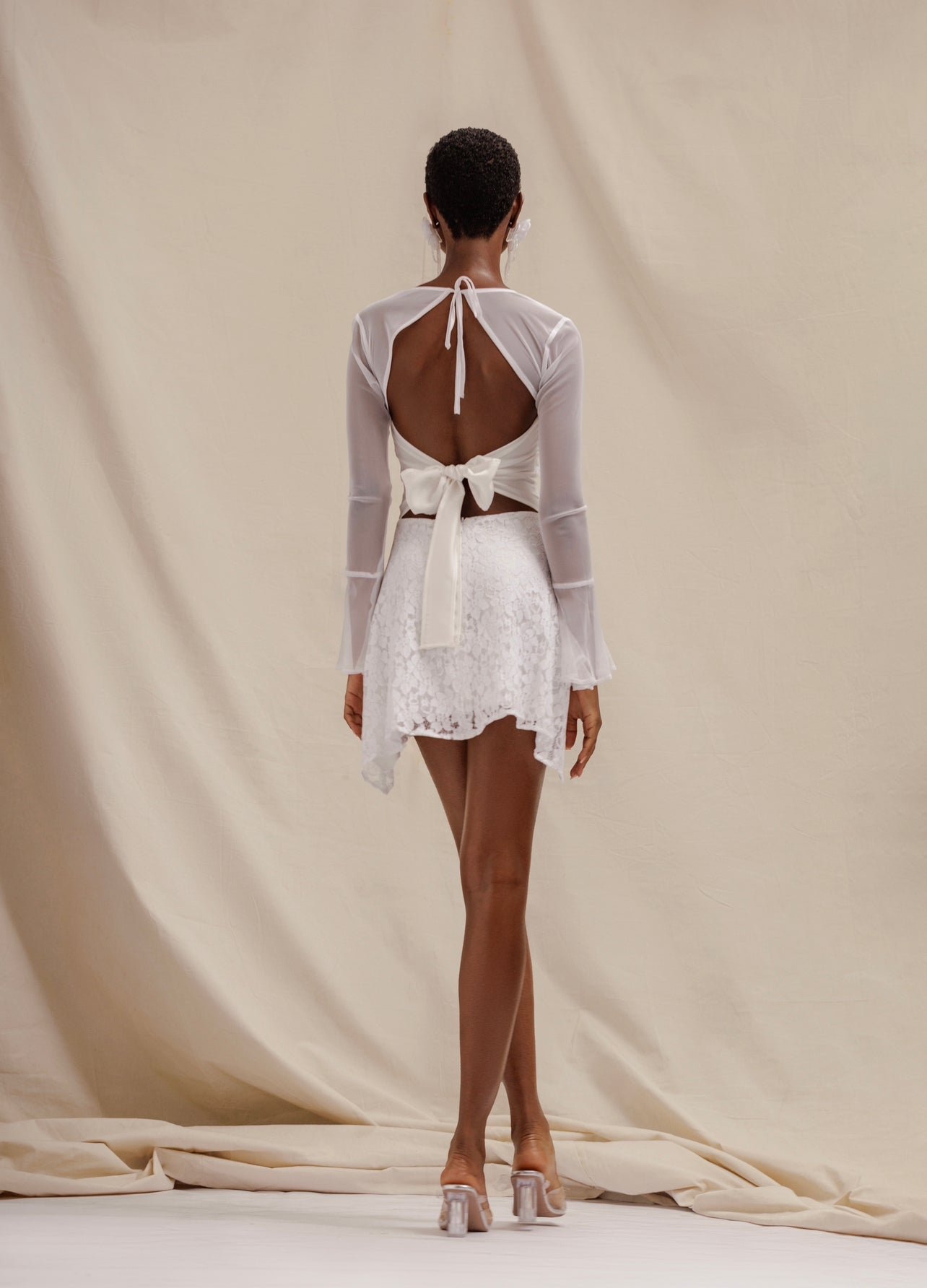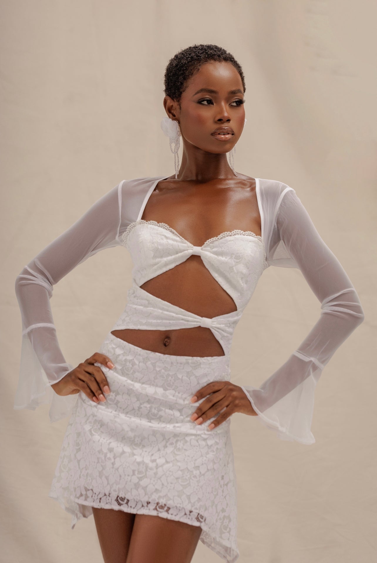 Featuring flirty lace and tantalizing cutouts, this mini dress is perfect for making a statement. Mesh bell sleeves and a tie at the back to cinch your waist. This dress is both sexy and innocent and perfect for either day or night.