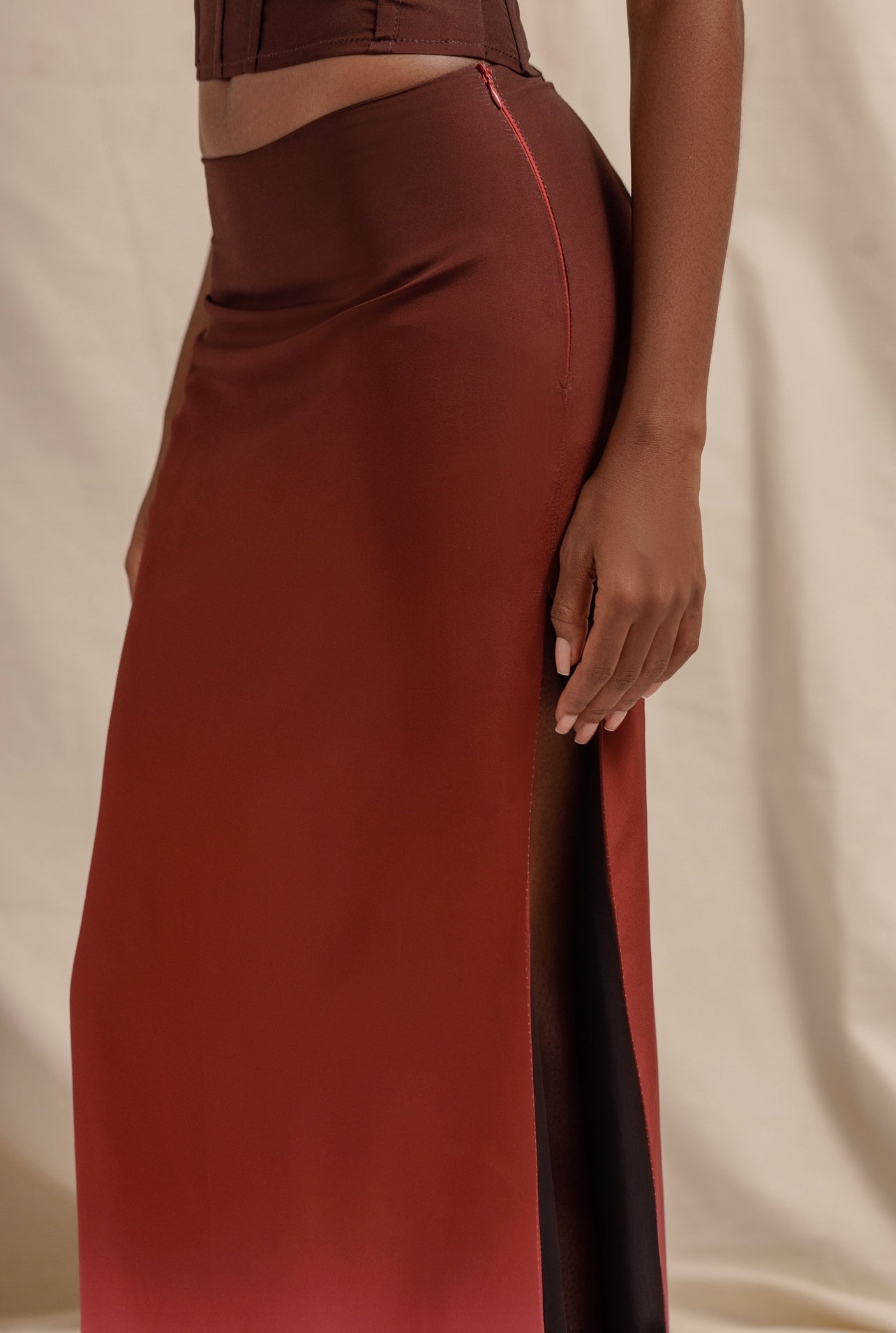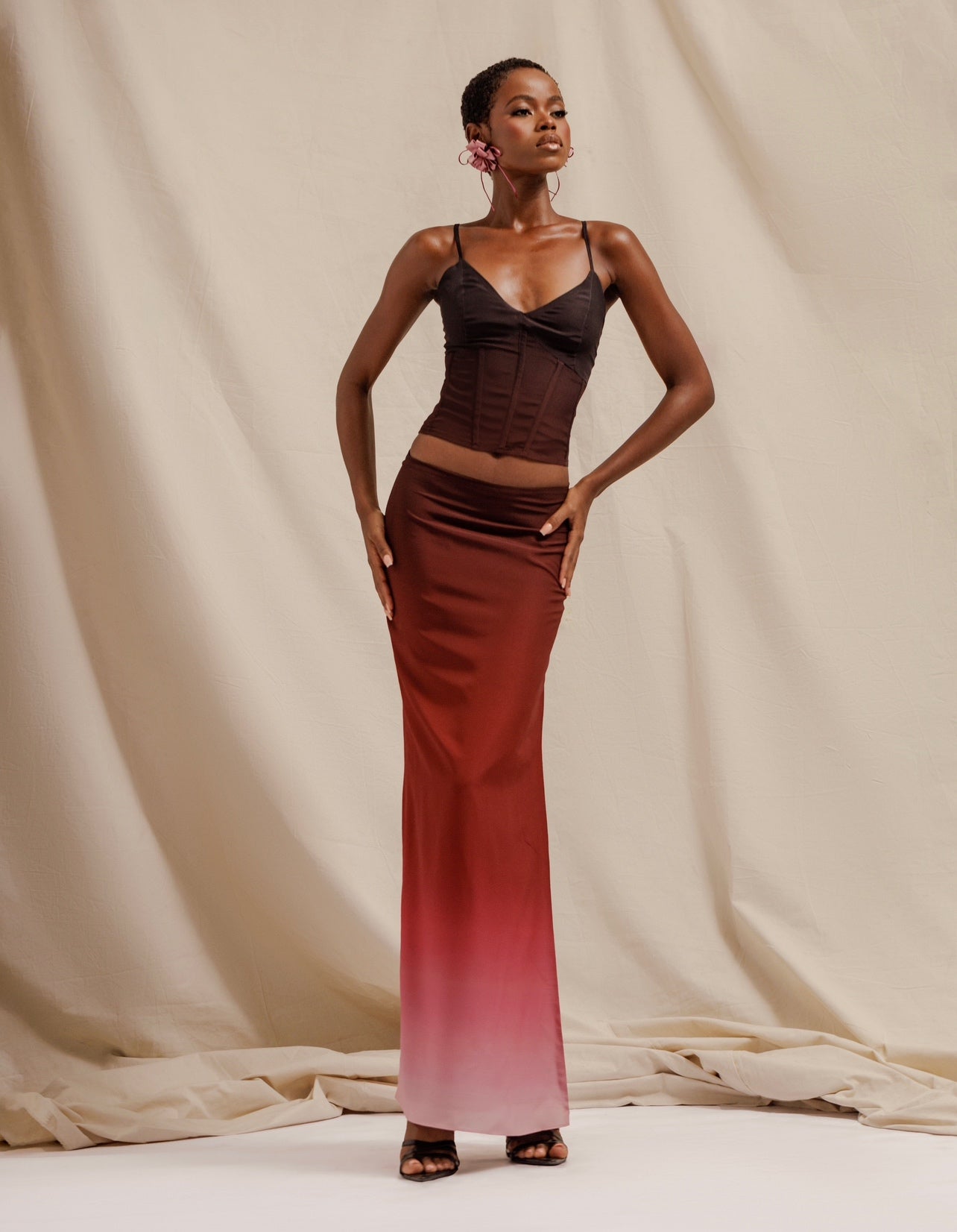 Make a statement in our Valentina Maxi Skirt, made from a thick chiffon fabric with a gradient print. With an ultra low rise look and thigh high side slit, you're sure to turn heads.